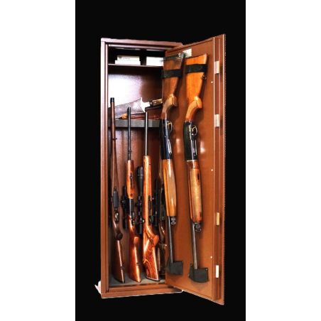 Fabricados con diferentes capas de acero de primera calidad y material aislante. Cerradura de seguridad, cumpliendo la Norma UNE EN 1300 Clase A, con llave que acciona los 6 bulones planos de gran tamaño y tres puntos de bloqueo. Blindaje especial en cerradura, rebloqueo en caso de ataque y puerta dotada con sistema anti-palanca. Dos estante interiores y sin zócalo inferior para no golpear las culatas. Anclaje metálico incluido para su instalación a la pared. Pintados en epoxi polvo de alta resistencia y duración horneados a 220º.