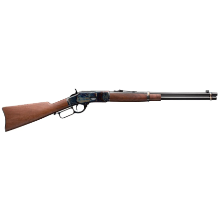 Configuración de carabina de competición del rifle de palanca Modelo 1873 con cantonera, cantonera de carabina templada en color, anilla de asiento y culata de nogal. Perforado/roscado para una mirilla opcional montada en el receptor. Una carabina clásica. El Modelo 1873 es ampliamente reconocido como el arma que conquistó el Oeste. Recamarado para los calibres de pistola más populares de la época, se ha producido en modelos de carabina, rifle y mosquete. Los tiradores aficionados al tiro vaquero adoran el confiable Modelo 1873 porque dispara la misma munición que su revólver.