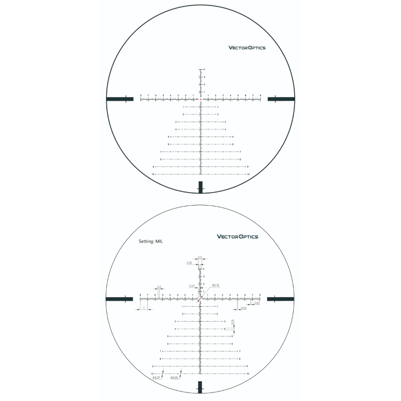 - Retícula táctica MIL VCT-34FFP de vidrio grabado, punto central iluminado con líneas y puntos digitales.
