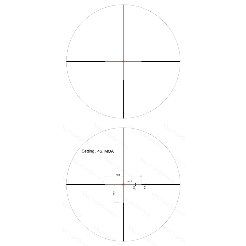 - Monotubo de 30 mm, 90% de transmisión de luz, retícula de fibra iluminada con punto central.