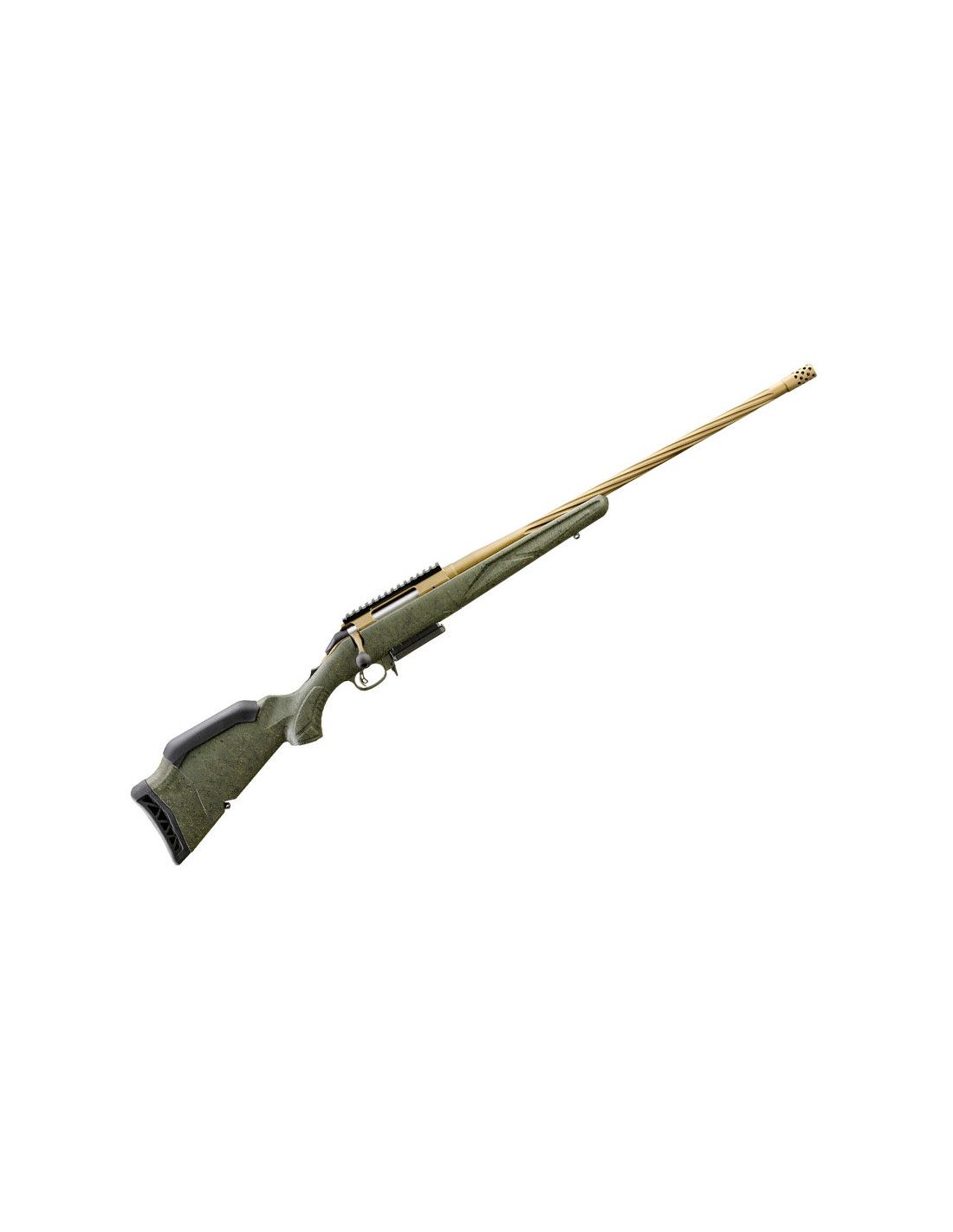 Los modelos estándar de Generación II Predator cuentan con una acción y cañón en acabado Cerakote™ bronce quemado duradero y una culata sintética en color verde oscuro texturizada con salpicaduras negras y grises para un excelente agarre y control del arma. El cañón de 22" (558mm.) de contorno medio, forjado y martilleado en frío, presenta profundas estrías en espiral, lo que mejora el equilibrio del rifle sin sacrificar la rigidez o la precisión. Viene con un freno de boca radial instalado de fábrica.